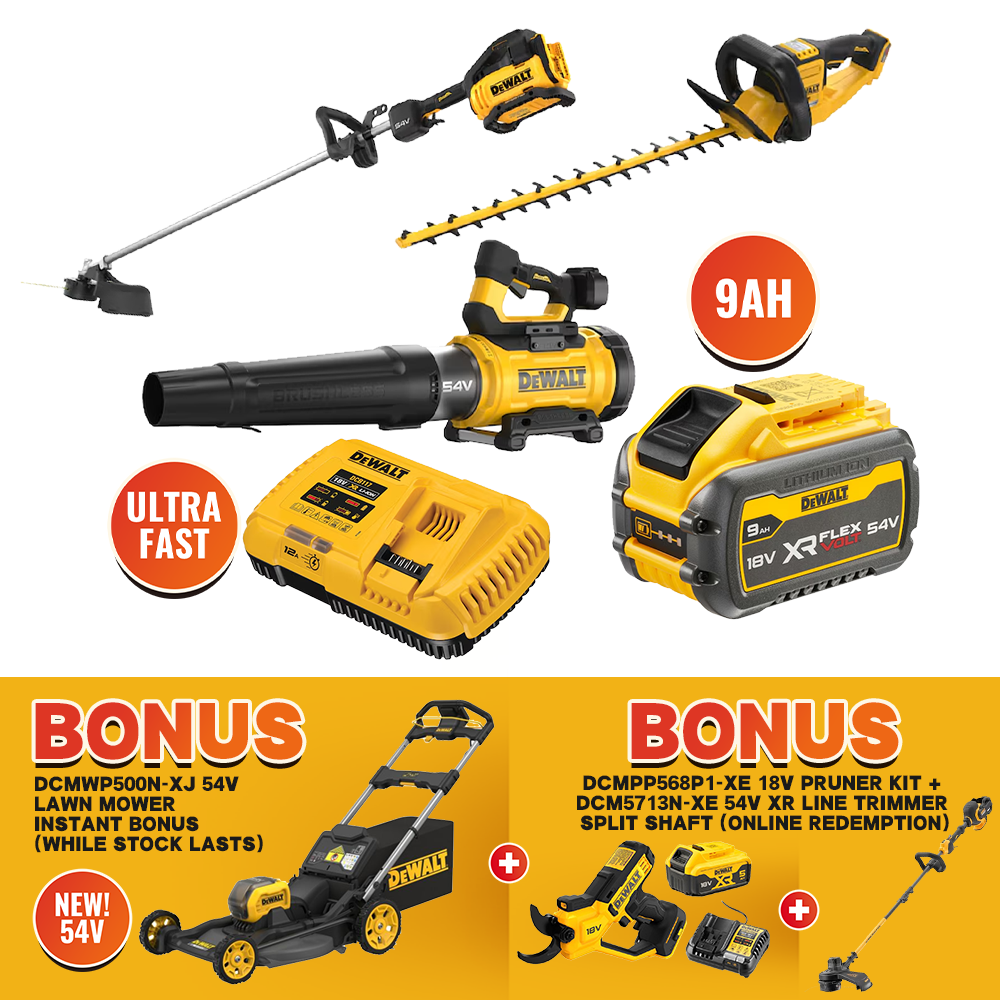 BONUS: DCMWP500N-XJ 54V Lawn Mower Instant Bonus (while stock lasts)+ DCMPP568P1-XE 18V Pruner kit + DCM5713N-XE 54V XR Line Trimmer Split Shaft (Online Redemption) Ends 31 January 2026