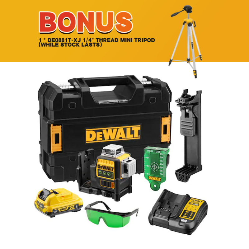 The Dewalt DCE089D1G-GB is a 3 way self levelling 360° cross line laser with a ultra bright green laser. Green lasers are x4 time more visible to the human eye than red lasers of the same output power. It also has the capability to project bright horizontal and vertical lines at 360°. Works with the Dewalt 10.8 volt battery platform.