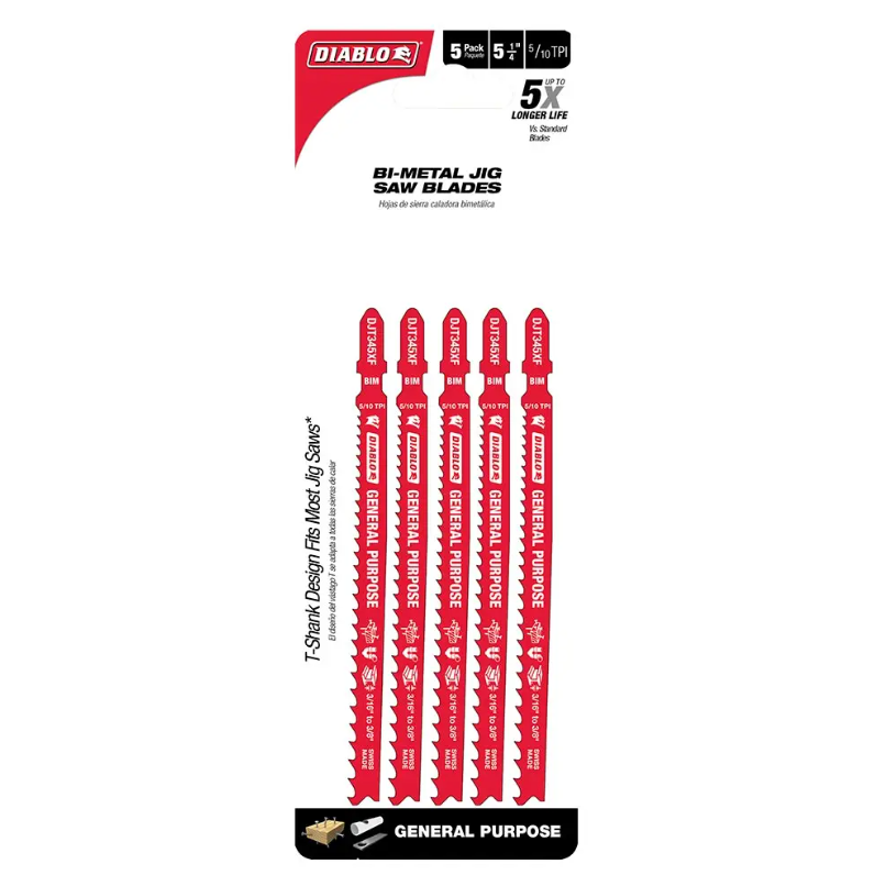 Diablo’s bi-metal teeth jig saw blades are specifically designed for maximum durability and longer life in wood, metal and plastic applications. These high-performance blades feature an ultra-hardened cutting edge to deliver up to 5X longer life than standard blades. The optimized blade design and Perma-SHIELD® non-stick coating reduces heat and pitch build up for effortless, clean cuts. T-shank design fits all combo and most U-shank cordless and corded jig saws.
