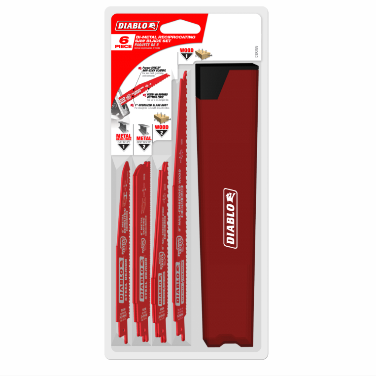 Diablo’s 6-Piece demolition reciprocating saw blade set brings together two of the brands top selling blades – Demo Demon and Steel Demon. Diablo’s reciprocating saw blades are specifically designed for maximum performance in nail-embedded wood and metal cutting/demolition applications. These high performance blades feature bi-metal technology that delivers up to five times longer life of standard blades on the market. Diablo’s Demo Demon blades feature patented variable tooth technology that provides faster cuts with less vibration. Diablo’s Steel Demon blades feature a double tooth configuration with small gullets for faster material removal and extra durability. This set is ideal for the Pro and has a free storage case included.