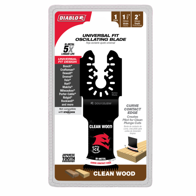 Diablo’s universal fit bi-metal oscillating blades feature application specific designs that deliver maximum durability and longer life in clean wood applications. These high-performance blades feature an ultra-hardened cutting edge to deliver up to 5X longer life than standard blades. Curve contact edge creates a pilot for precise, clean plunge cuts with less vibration. An optimized Japanese tooth design and Black I.C.E. (Industrial Cooling Element) keeps the teeth cool and build up free for fast, clean cuts. The blade’s universal fit, adapter-free design easily attaches most tools, with the exception of Starlock tools.