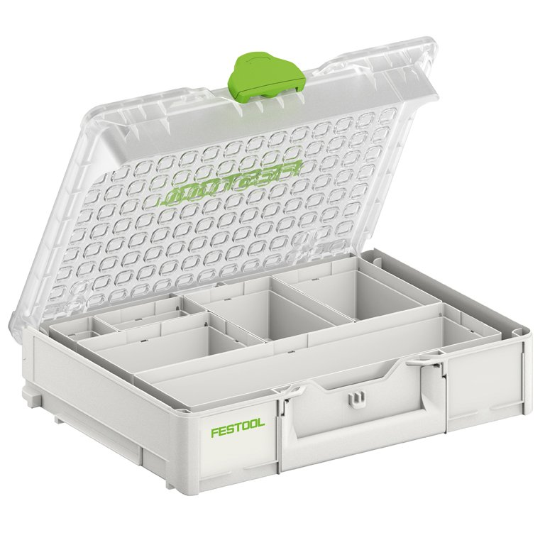Small parts, accessories and consumables are safely stored away in the various plastic containers and are easy to transport. The transparent lid provides a quick overview. Thanks to the established T-LOC central control element, it can be closed, opened and connected with a single turn.