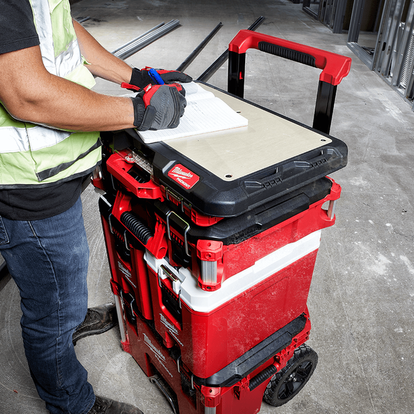 Our PACKOUT™ Customisable Work Top is constructed with impact-resistant polymers and ½” marine grade wood top that provides you with a durable, portable work surface for assembly and writing tasks. As part of our PACKOUT™ Modular Storage, the worktop allows you to customise your storage system for easy transportation and organisation of tools and accessories. The customisable worktop has a 22.5kg weight capacity and a fastener-ready design, which allows you to attach vises, chargers, and a variety of other items to the top of your PACKOUT™ stack for easy and secure transport. The MILWAUKEE® PACKOUT™ Modular Storage System is the industry’s most durable and versatile storage system.