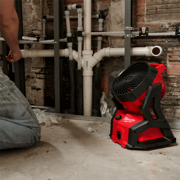 The M18™ PACKOUT™ Jobsite Fan’s brushless motor quickly propels air up to 33 km/h and 24 m3/min making the fan ideal for personal cooling. PACKOUT™ compatibility provides unmatched mobility, saving down time spent hauling tools on and off the site. The 178mm (7″) blade, optimised for increased run-time, delivers over 3 hours of use on high and 6.5 hours at 75% speed with our M18™ REDLITHIUM™ 5.0Ah Battery (M18B5). The M18™ PACKOUT™ Jobsite Fan also includes an AC Power Cord for extended run-time and has a variable speed dial and a 300-degree adjustable head, providing optimal airflow for any job. The impact resistant design along with dust and water ingress protection withstands demanding job site environments. The keyholes, pass-through holes and PACKOUT™ compatibility allows the fan to be mounted in unique positions and orientations across the jobsite.