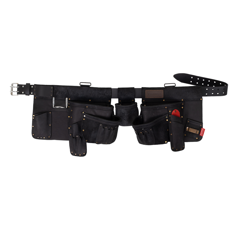 The BuildPro ‘Gladiator’ Tool Belt is a premium, hand-crafted tool belt made from full grain leather for maximum durability. It features a 50mm heavy-duty, replaceable leather belt, and includes metal D-Rings for attaching shoulder braces for extra support. The belt boasts premium quality hardware, double stitching, and heavy-duty rivets for reinforcement at high-stress points.